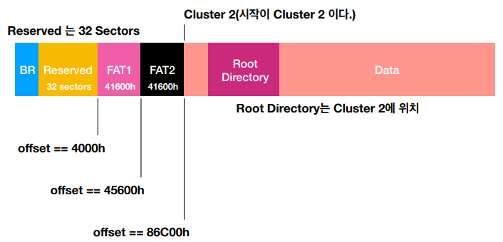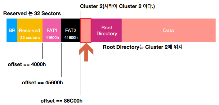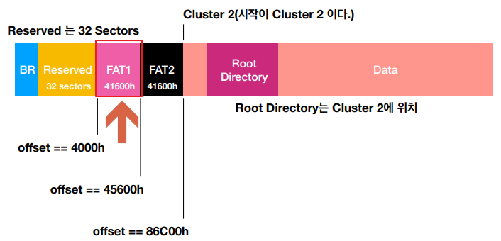 FAT1에서는 하나의 클러스터를 4 Bytes로 표현하고 있다. 그리고 클러스터2는 항상 루트 디렉토리가 존재함을 의미한다.