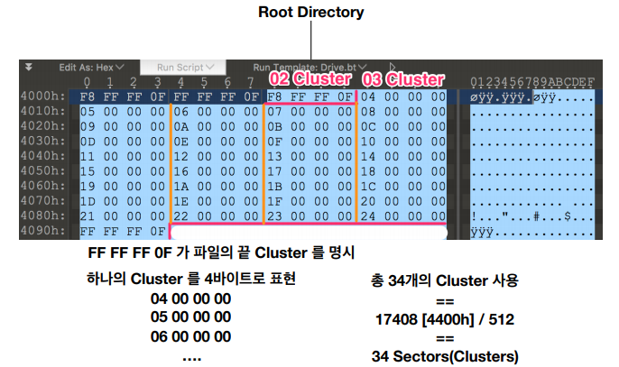 그리고 실제 사용중인 클러스터를 확인하려면 루트 디렉토리를 의미하는 클러스터2의 뒤인 클러스터3 부터 'FF FF FF 0F'(파일의 끝)' 까지 몇 개의 클러스터가 있는지를 확인하면 된다. 아래의 노란색 부분이라고 할 수 있으며 여기서는 총 34개의 클러스터가 사용되고 있다.