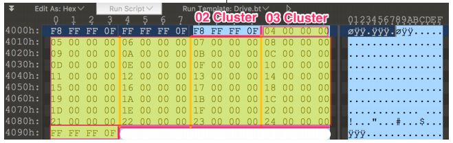 FAT1 영역은 BR의 끝지점(4000h)에서 시작한다. 그 시작에는 항상 'F8 FF FF 0F (거꾸로 읽어야 됨)' 가 있고, 마지막엔 'FF FF FF 0F(거꾸로)'가 있다. 그리고 FAT1 영역에서는 실제 어떤 클러스터가 사용중인지 사용중이지 않은지에 대한 내용을 확인할 수 있다.