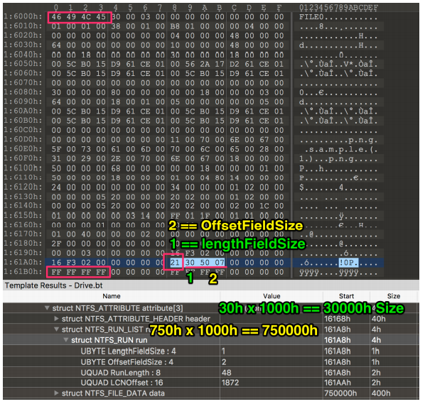 그림 12의 첫번째 네모 박스인 46 49 4C 45는 파일 레코드의 시작을 의미하며, 그림 12의 아래에서 데이터의 시작 위치에 대한 정보(노란색)와 데이터의 크기(초록색)를 알 수 있다. (1000h를 곱하는 것은 클러스터의 크기만큼 곱해주는 것이다.)