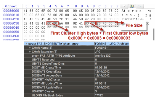 데이터의 크기는 First Cluster low bytes 바로 뒤인 86C30h의 C~F에서 확인 할 수 있다. 여기서는 00 00 43 28 즉, 17192 Bytes가 데이터의 크기이다. 참고로 17192를 섹터의 크기는 512로 나누면 33.57이다. 즉 34개의 클러스터를 사용하고 있다는 것을 다시 한번 확인할 수 있다.