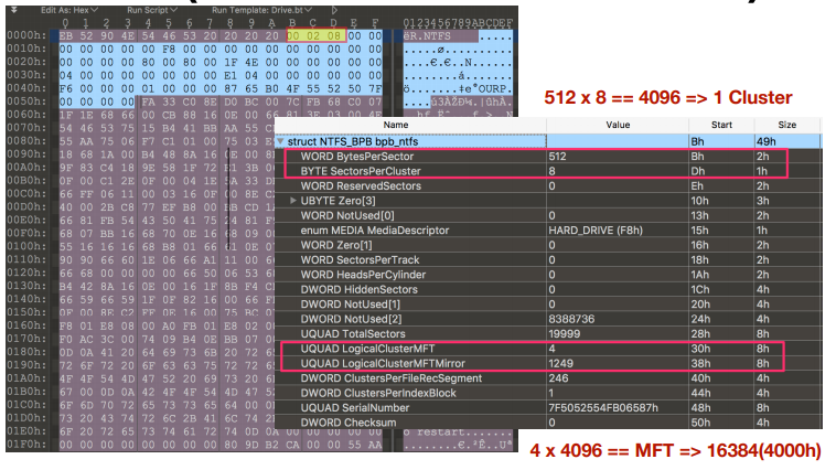 그리고 그림10의 2번째 네모를 보면 MFT의 위치를 알 수 있다. LogicalClusterMFT는 MFT의 Offset 이다. 4로 나와있는데 이는 4개의 클러스터 뒤에 MFT가 있다는 것이며, 4 * 4096 = 16384 = 4000h 이므로 4000h부터 MFT 인 것을 알 수 있다.
