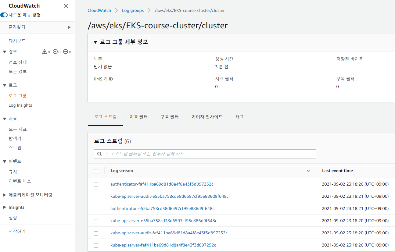 각각의 로그 타입은 자신만의 클라우드와치 로그 스트림을 생성한다. 그리고 /aws/eks/cluster-name/의 prefix를 가진다.