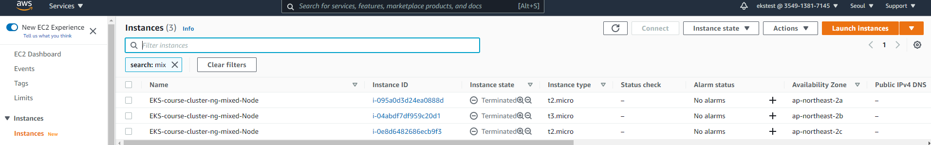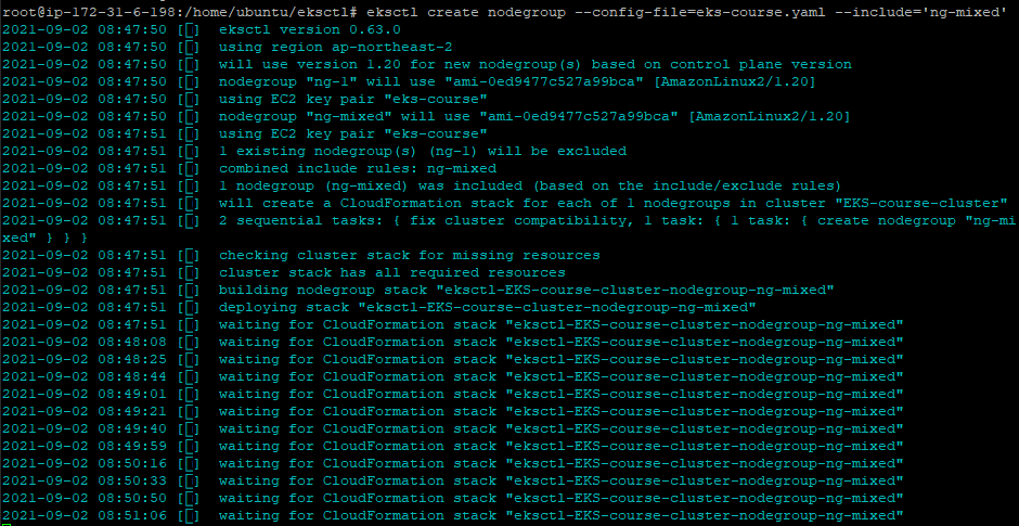 이미 노드 그룹 ng-1은 실행되어지고 있기 때문에 --include 파라미터로 ng-mixed 라는 새로운 노드 그룹을 지정해줬다.