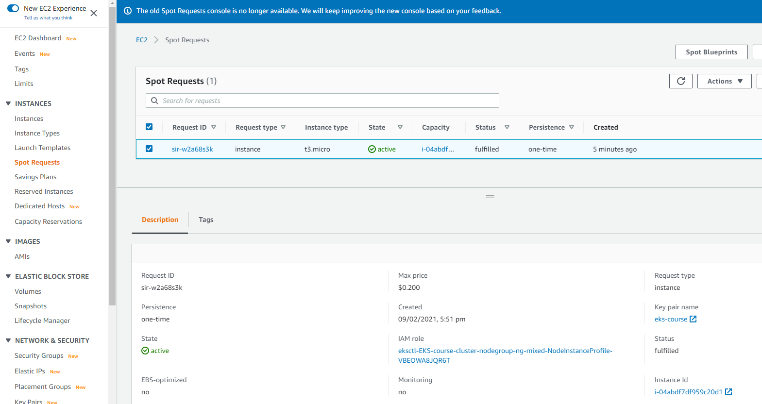 파드의 request와 limit 정책으로 인해 1개의 노드로는 감당이 안되서 자동으로 1개의 노드를 더 띄워준 것이다. 실제로 콘솔에서 스팟 인스턴스를 확인해보면 2개가 떠있다.