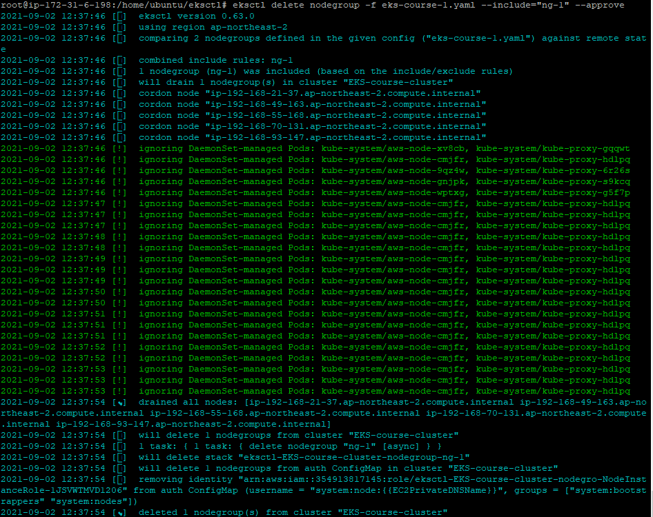 eksctl delete nodegroup -f eks-course.yaml --include="ng-1" --approve