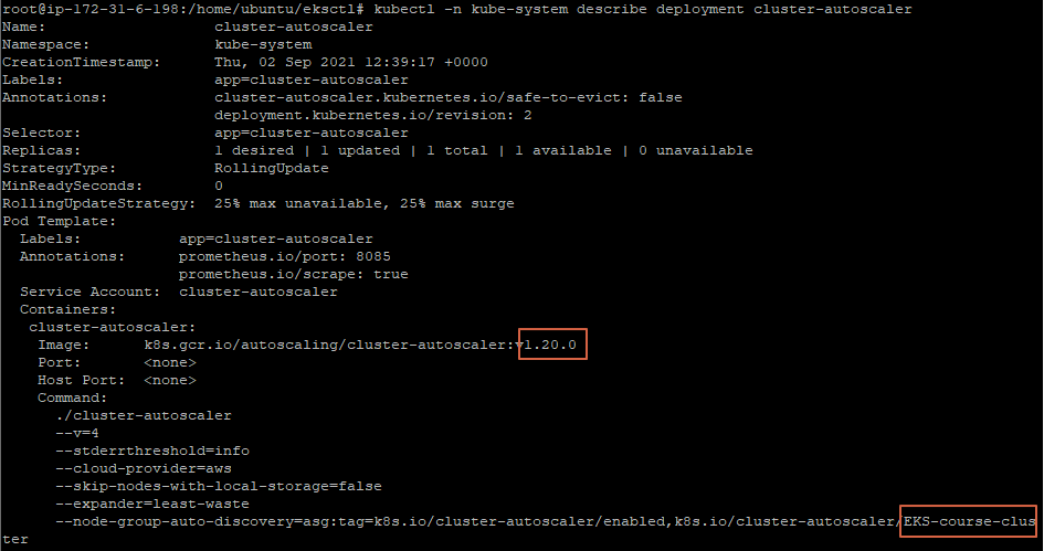 kubectl -n kube-system describe deployment cluster-autoscaler