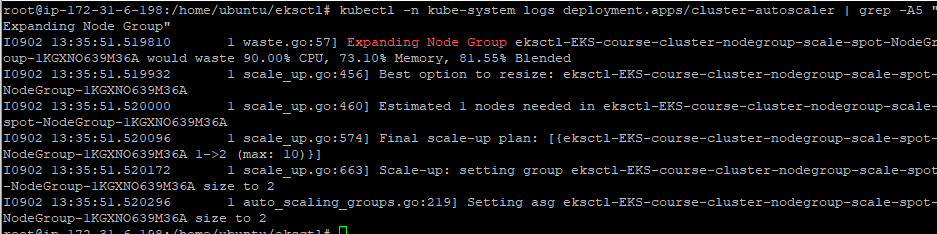 kubectl -n kube-system logs deployment.apps/cluster-autoscaler | grep -A5 "Expanding Node Group"