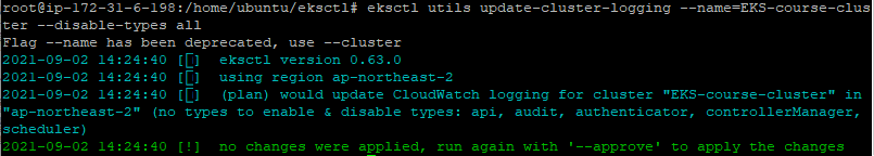 eksctl utils update-cluster-logging --name=EKS-course-cluster --disable-types all --approve