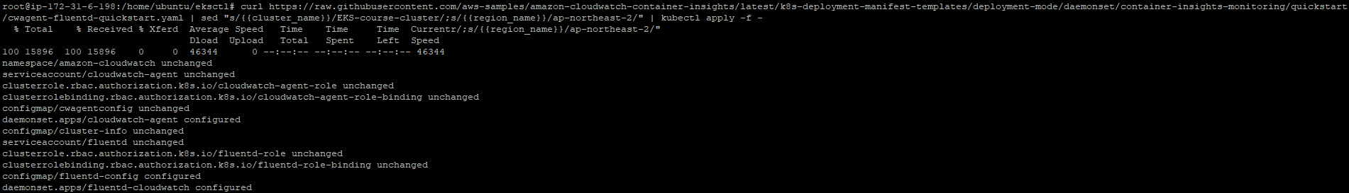 curl https://raw.githubusercontent.com/aws-samples/amazon-cloudwatch-container-insights/latest/k8s-deployment-manifest-templates/deployment-mode/daemonset/container-insights-monitoring/quickstart/cwagent-fluentd-quickstart.yaml | sed "s/{{cluster_name}}/EKS-course-cluster/;s/{{region_name}}/ap-northeast-2/" | kubectl apply -f -