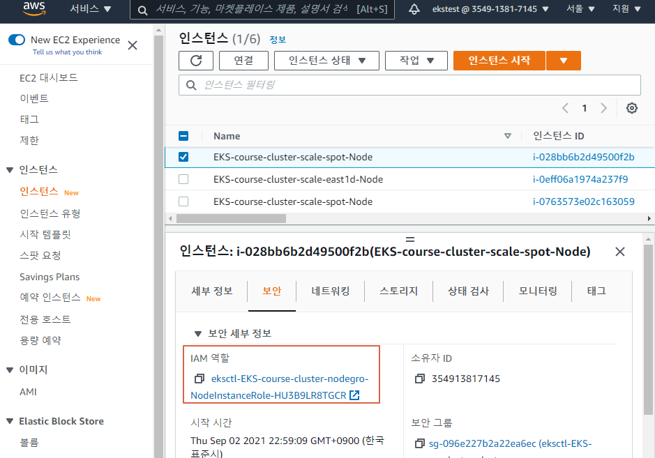 먼저 노드 인스턴스의 IAM 역할을 클릭해서 들어간다.