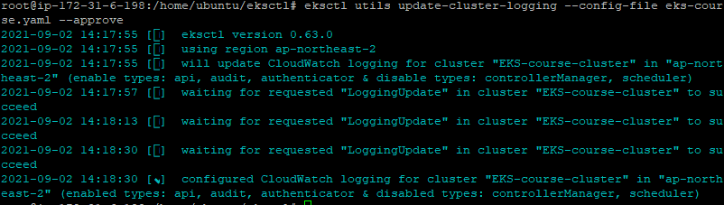 eksctl utils update-cluster-logging --config-file eks-course.yaml --approve