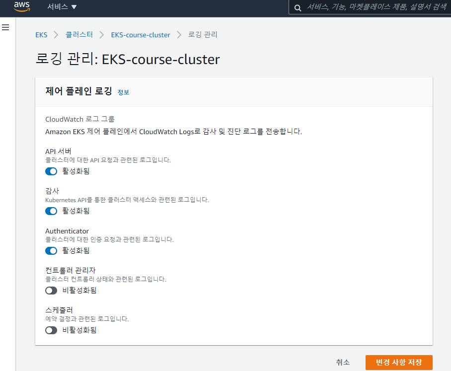 그리고 AWS EKS 대시보드 콘솔에서도 로깅에 대한 설정을 변경할 수 있다.
