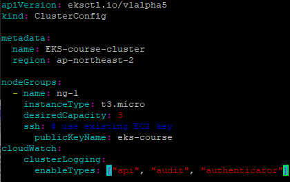 초기 ks-course.yaml 파일에 cloudwatch를 수정해서 다시 생성해보자.