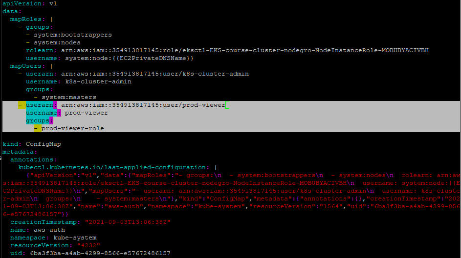 이제 생성한 prod-viewer 사용자를 쿠버네티스 aws-auth 네임스페이스에 추가하자.