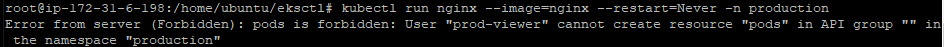 kubectl run nginx --image=nginx --restart=Never -n production -> production 네임스페이스 이지만 read 권한이 아닌 run 이므로 실패