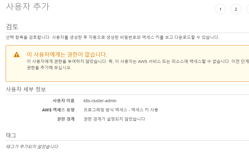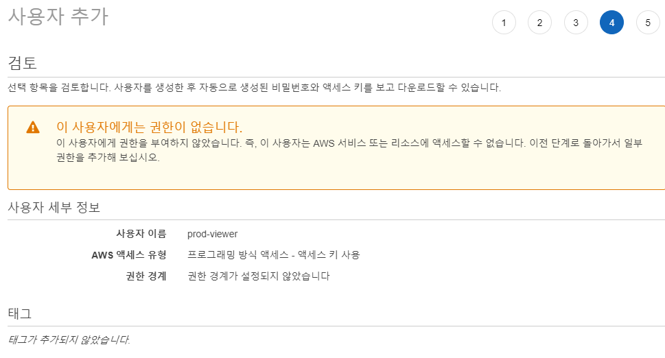 이후 IAM 콘솔에서 아무런 권한이 없는 사용자를 생성하자.