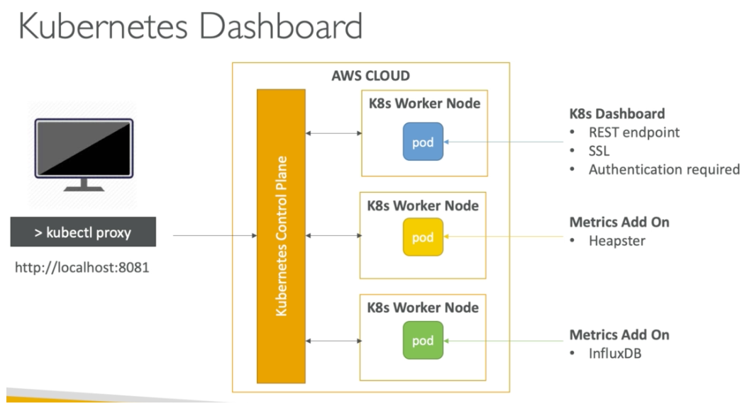 Kubernetes Dashboard의 구성은 대략 다음과 같다. (참고로 heapster 대신 metrics-server를 사용한ㄷ. 그림은 대략 참고만)