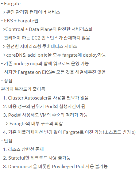 서버리스 쿠버네티스를 지원하는 서비스이다. 즉, fargete 사용 시 쿠버네티스 사용 시 EC2, OS, 오토스케일링 등에 대해서 신경쓰지 않아도 AWS에서 알아서 해준다는 말이다. 여기까지 들으면 무조건 fargate 써야지 라고 할 수 있는데 꼭 장점만 있는 것은 아니다. 장, 단점에 대해서는 다음의 블로그에 잘 표현되어 있어 가져와본다. 아래에도 써있지만 stateful 한 워크로드는 사용못한다.