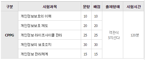 예를들어, '개인정보보호의 이해'는 10%의 배점비율을 '개인정보의 보호조치'는 30%의 비율을 가진다.