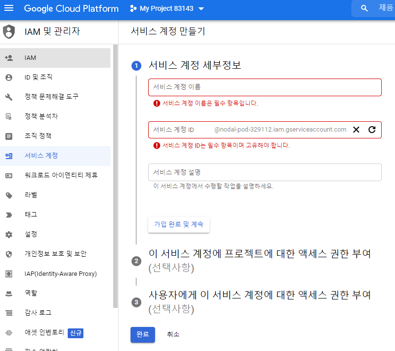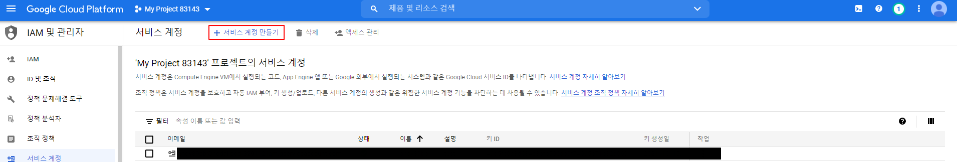 생성된 프로젝트로 진입하여 서비스 계정 만들기