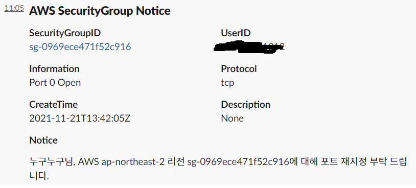 AWS 시큐리티 그룹을 운영하다보면 종종 대상 포트를 0으로 입력하는 실수를 하는 경우가 있는데, 이 때 SLACK으로 알림을 주는 기능을 구현했다. (테스트는 필자의 개인 AWS 계정 및 개인 SLACK에서 진행)
