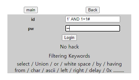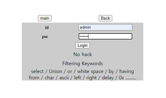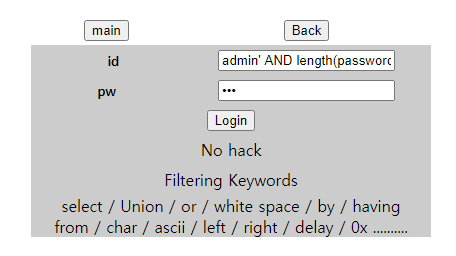 비밀번호에 필터링 되고 있는 문자열들을 넣어보면 No hack 라는 메시지가 나오고, 요청은 GET 방식으로 전달되고 있다.