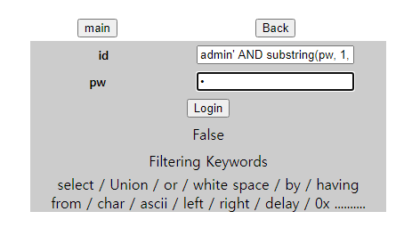 admin' AND substring(pw, 1, 1) == a (pw 문자열의 1번째부터 1개의 문자열을 가져와라)