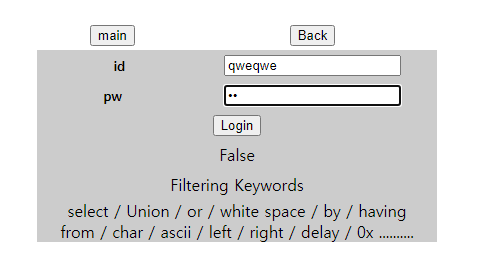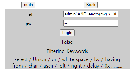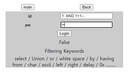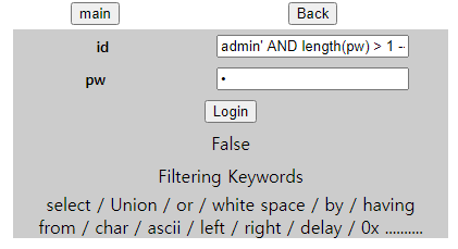False가 출력된다. 더이상 필터링 되는 것은 없다. 2번째 시도의 결과에서 얻을 수 있는 것은 1이라는 계정은 존재하지 않는다는 것이다. 계정명을 모른다면 몇가지 더 시도해봐야 겠지만, 우리는 힌트에서 계정명을 알고 있으니 확인 차 3번째 시도를 통해 admin 계정이 존재하는지 확인해보자.
