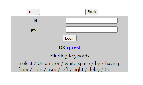 추가로 몇가지 더 테스트해본 결과, pw에 아무것도 입력하지 않으면 동작하지 않고, ' 문자열은 필터링 되고 있지 않다. 이것을 기반으로 블라인드 인젝션을 시도해보도록 하자. 블라인드 인젝션은 하나씩 단계별로 진행하는 스무고개 같은 것이므로 시도할 법한 내용들을 순서대로 나열한다.