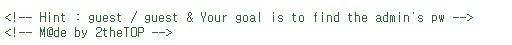guest/guest로 로그인하고, 최종적으로는 admin 계정의 비밀번호를 알아내는 것이 목표인 것으로 보인다.