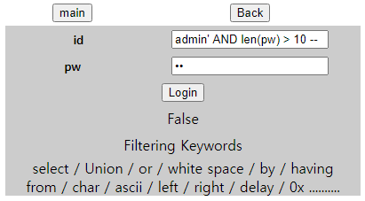 admin' AND length(비밀번호 컬럼) > 10 -- 와 비슷하게 진행할 예정인데, 우리는 비밀번호 컬럼명을 모른다.