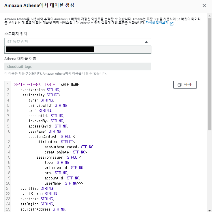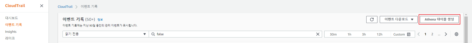 이후 이벤트 기록에서 Athena 테이블 생성을 클릭