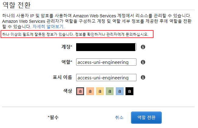 이제 사용자 계정의 태그와 일치하는 역할인 access-peg-engineering로 역할 전환을 시도해봅니다. 그럼 아래와 같이 역할 전환이 성공적으로 된 것을 볼 수 있습니다.