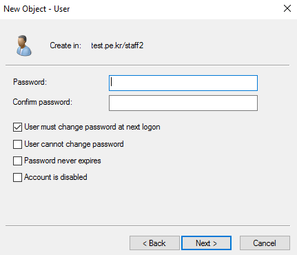 이는 OU에서 Users를 생성할 때, 아래와 같은 정책을 설정했기 때문이다.