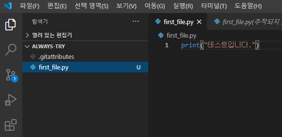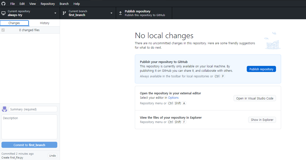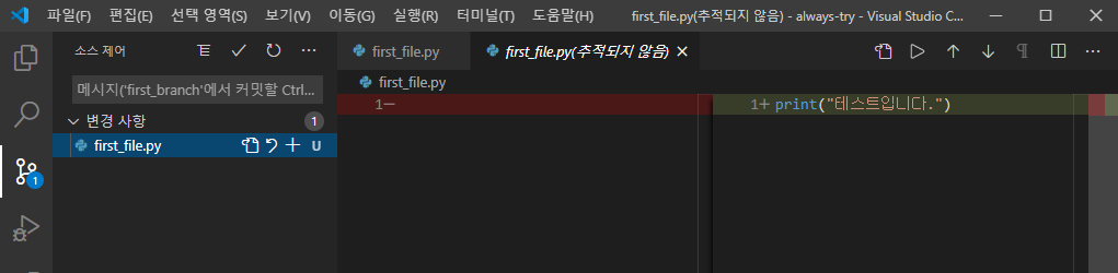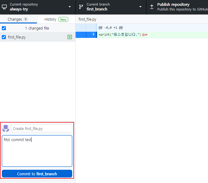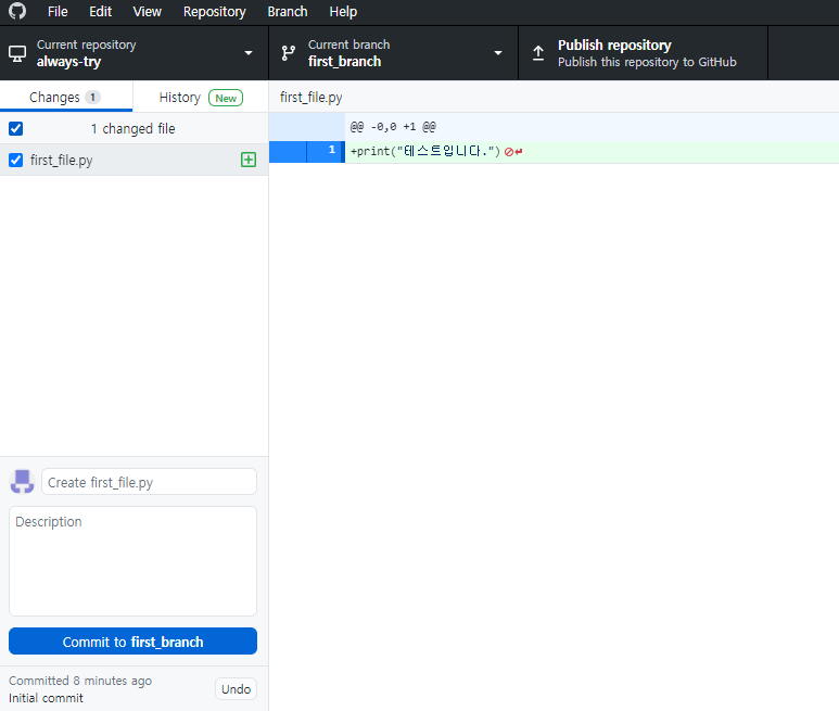 그리고 first_file.py라는 파일을 생성해보면 다음과 같이 이벤트 알림이 1개 발생하는 것을 볼 수 있으며, github desktop app에도 관련 내용을 확인할 수 있다.