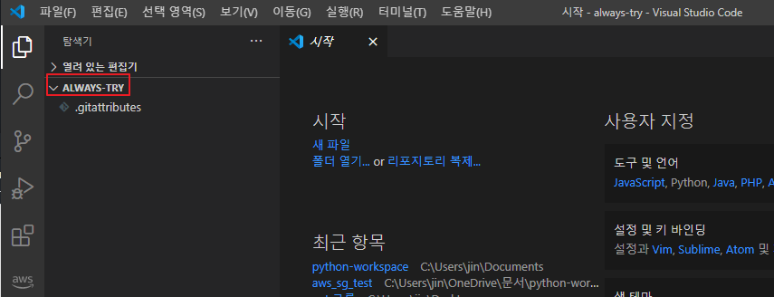 생성 후 visual studio code에서 repository를 오픈해본다.