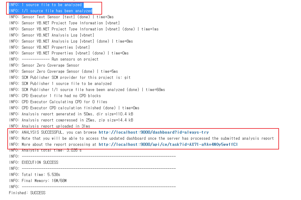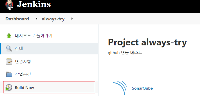 이후 Build Now 후 Jenkins 로그를 통해 어떻게 진행되는지 보자. 빌드 과정에서 SonarQube로 소스코드 분석을 요청하고 동작하고 있는 것을 확인할 수 있다.