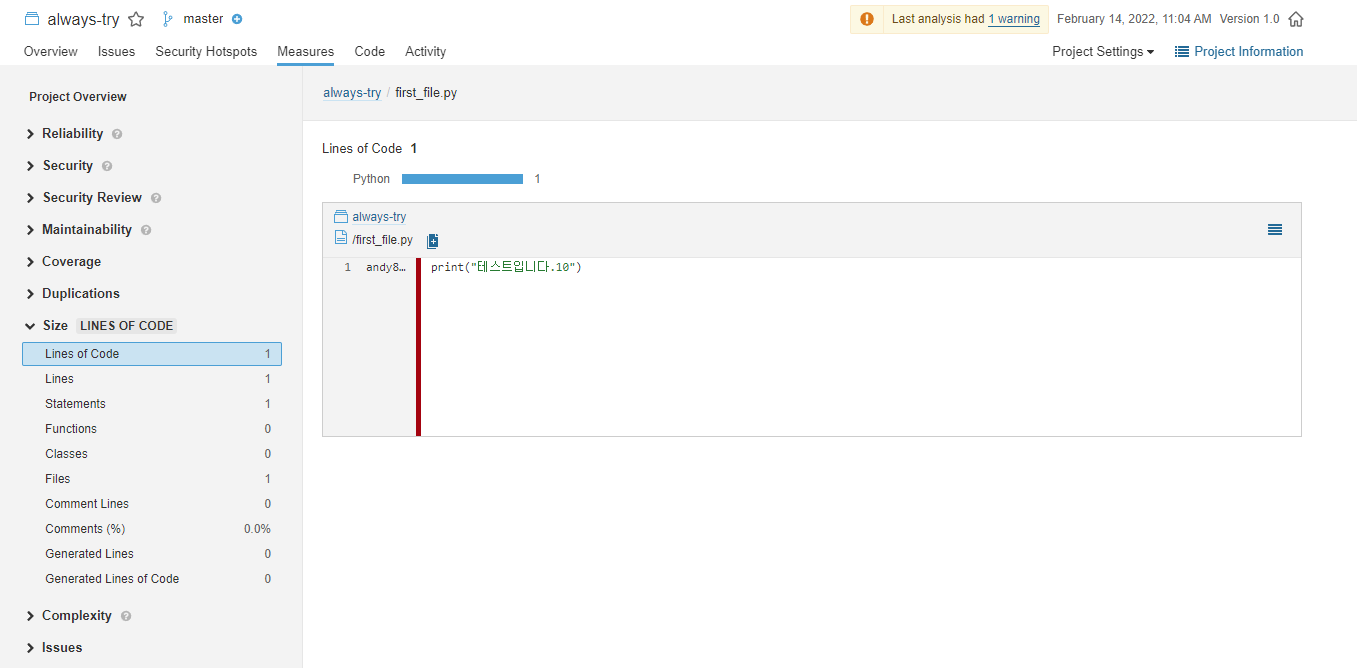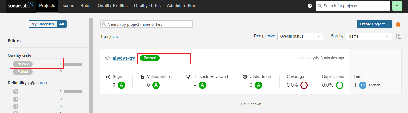 이제 SonarQube로 이동해보면 아무것도 없없던 Project 옆에 'Passed'라는게 생겼고 숫자도 모두 미묘하게 조금씩 변해져있다. 1 Line의 파이썬 코드가 1개 있었는데, 잘 검사가 된 것으로 보이고, 특이사항이 없어서 빌드까지 완료된 것으로 보인다.