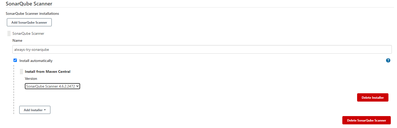 다음으로 Jenkins 관리 > Global Tool Configuration > SonarQube Scanner > Add SonarQube Scanner 에서 SonarQube Scanner를 등록해준다. 아까 설치한 SonarQube Scanner 경로를 지정해주는 것으로 예상했는데, 새로 설치하도록 메뉴를 안내하고 있다.