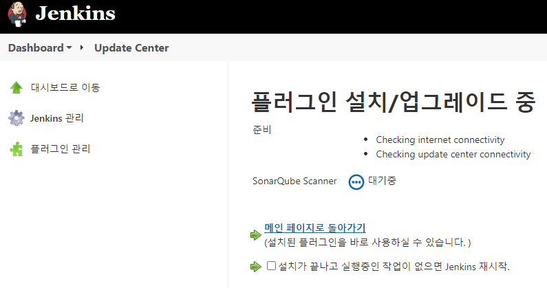 계속 기다려도 자동으로 재시작이 안되서 그냥 실행중인 jenkins 프로세스를 종료했다가 다시 실행했다.