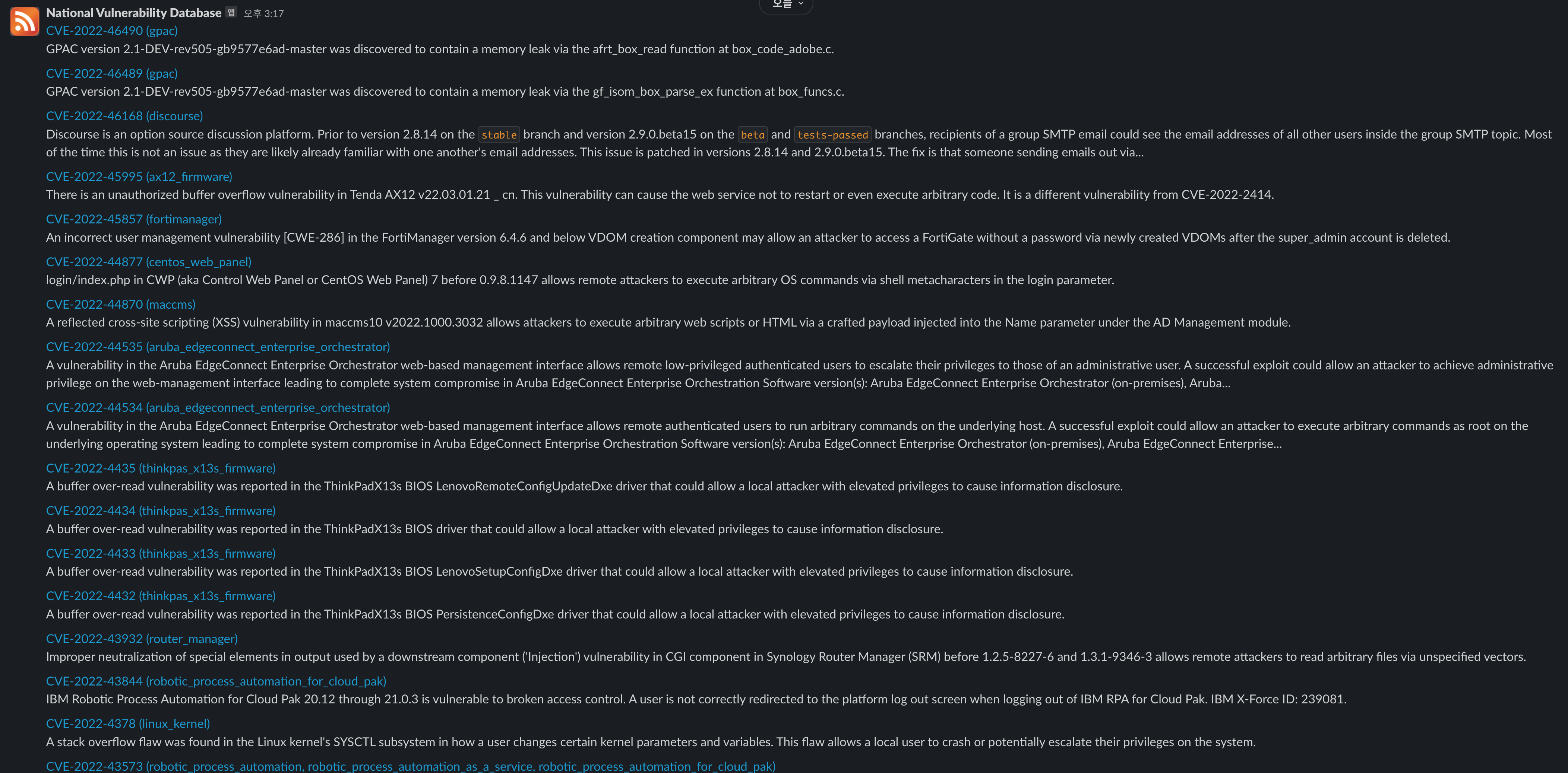 CVE 취약점 알림봇 만들기 (슬랙 RSS 앱) 본문