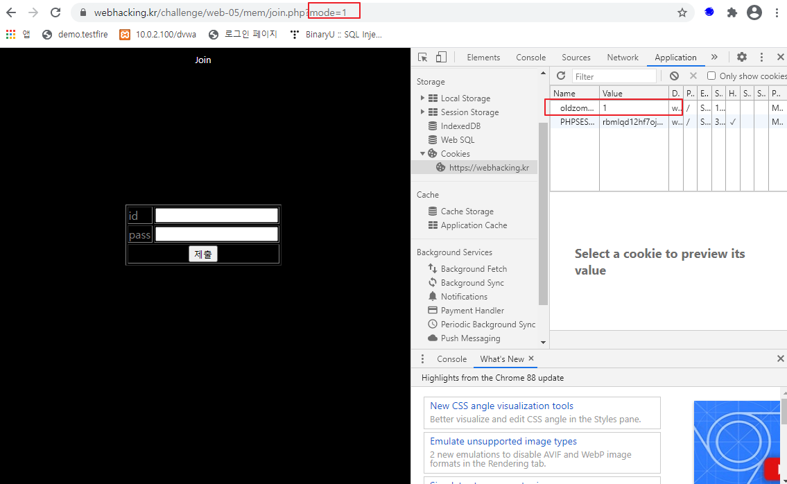 - 쿠키 값에 oldzombie 문자열을 넣고, url에 mode=1 을 추가하면 join.php 를 띄워줄께