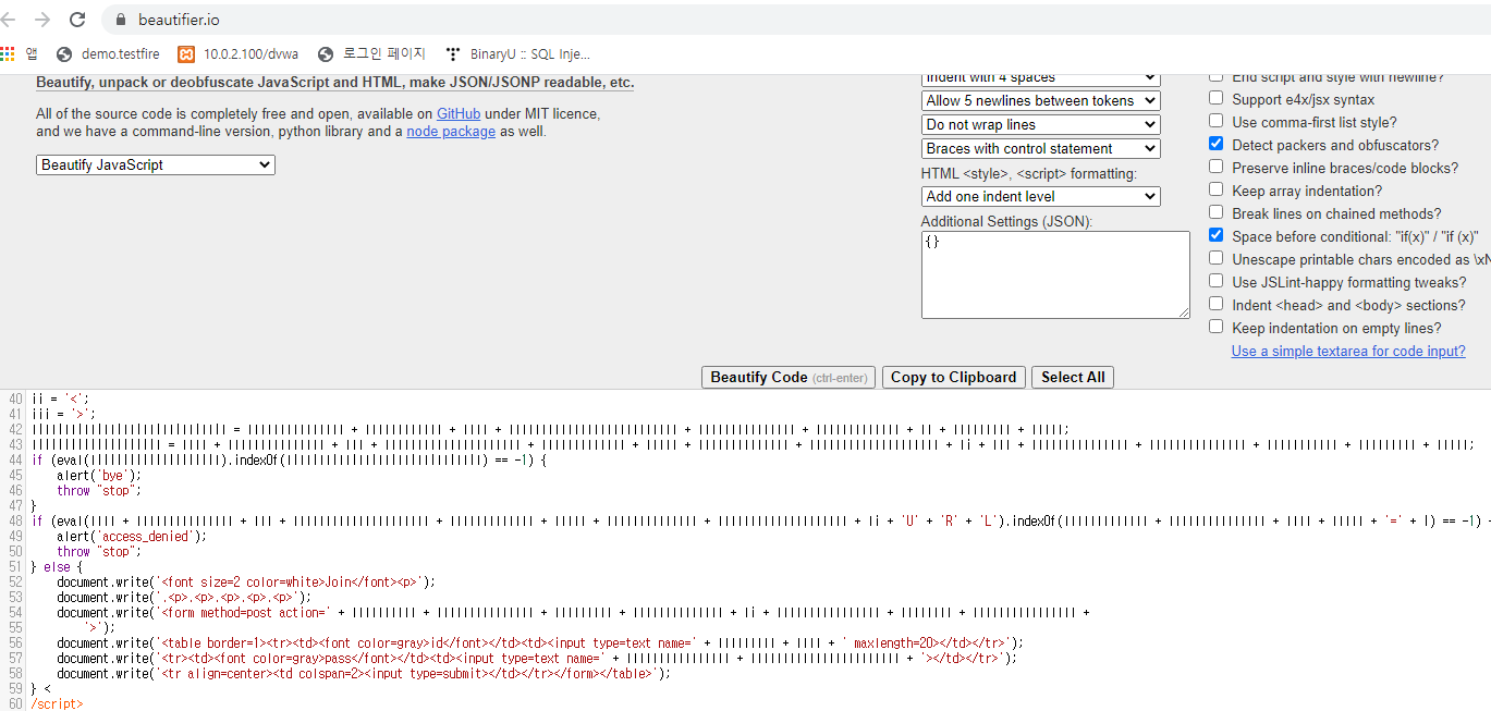 확인을 클릭하면 빈 페이지가 나오는데, 페이지 소스보기를 했더니 수상한 것이 나타났다. 난독화 되어있는 것으로 보인다.