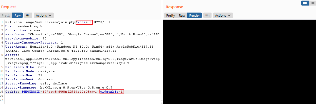 URL이야 뒤에 ?mode=1 을 입력하기만 하면되는데, cookie 값 변조에서 의문점이 생겼다. burp suite로 쿠키 값에 oldzombie를 추가해서 요청을 날렸더니 계속에서 bye가 뜬다. bye라는 것은 oldzombie를 인식하지 못한다는 것이다.