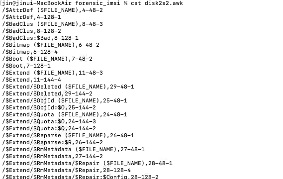 | awk -F '|' '{print $2","$3}' disk2s1.fls > disk2s2.awk • -F '|' :: 구분자를 지정한다. 현재는 | 를 구분자로 한다. • '{print $2","$3}' | 구분자로 나누어진 2번째, 3번째 column 을 출력한다. |