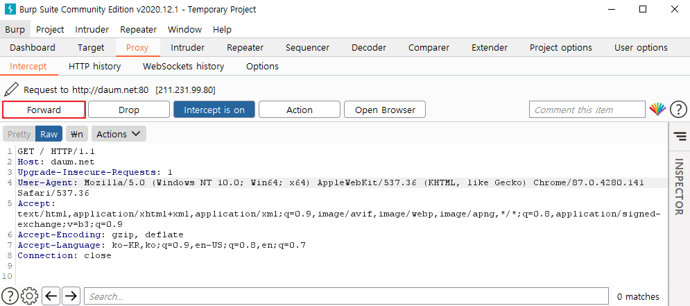 바로 위에 나온 화면은 Burp suite가 크롬의 구글 접속 요청을 잡고 있는 것이고, Forward 를 클릭하면 그 요청을 다시 구글로 보낸다.
