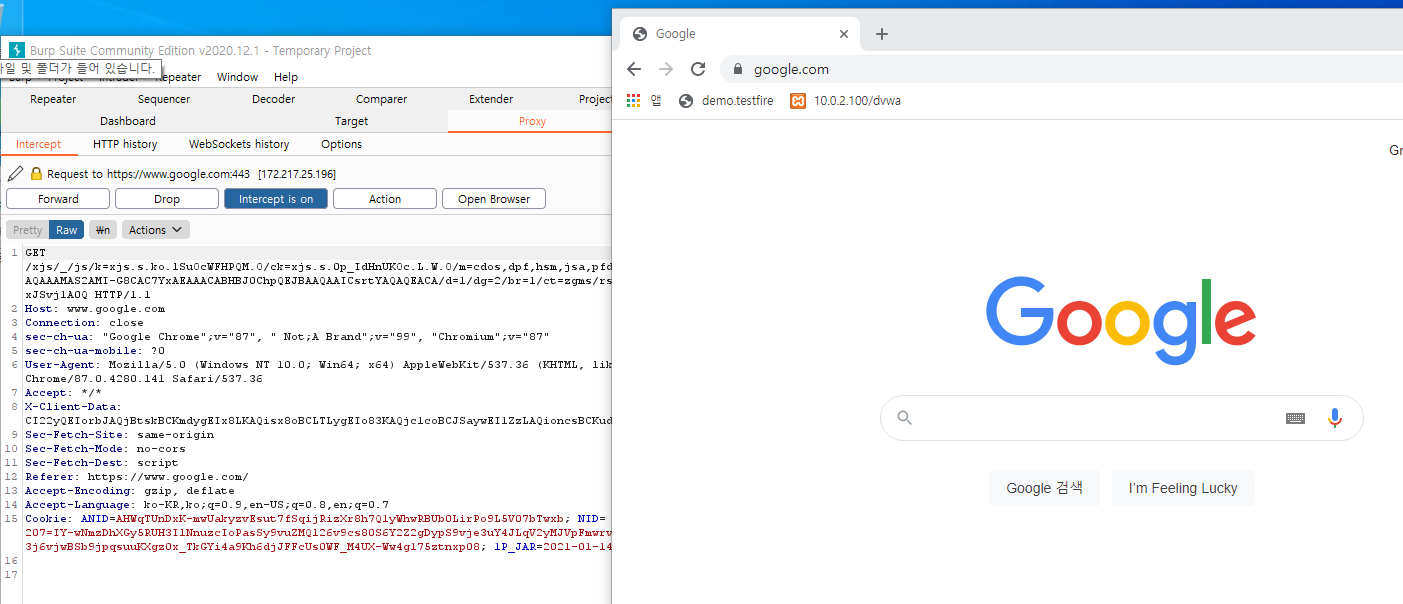 (프록시 설정 후) : 크롬 -> Burp suite -> 구글
